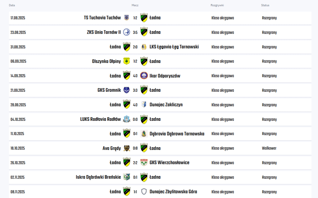 Piłkarze LKS-u Ładna mogą pochwalić się naprawdę znakomitą i bardzo udaną rundą jesienną w sezonie 2025/26. Pod czujnym okiem trenera Grzegorza Jasiaka drużyna zakończyła jesień na wysokim, drugim miejscu w tabeli, zdobywając łącznie aż 28 punktów. Bilans tego osiągnięcia to aż 8 zwycięstw, 4 remisy oraz zaledwie jedna porażka, co świadczy o dużej sile i stabilności zespołu.