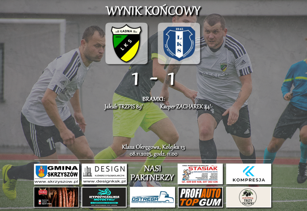 Za piłkarzami LKS-u Ładna ostatni ligowy mecz w tym roku kalendarzowym. W minioną sobotę nasi zawodnicy zagrali spotkanie, które zakończyło się podziałem punktów z beniaminkiem tarnowskiej Klasy Okręgowej – drużyną Dunajca Zbylitowska Góra, remisując na własnym boisku 1:1. Obie bramki padły w kluczowych momentach meczu, tuż pod koniec pierwszej oraz drugiej połowy. Najpierw na prowadzenie wyszli goście, którzy zdobyli gola z rzutu karnego, a na listę strzelców wpisał się Kacper Zacharek. Na wyrównanie kibice naszego zespołu musieli czekać naprawdę długo, jednak ostatecznie Ładnej udało się…