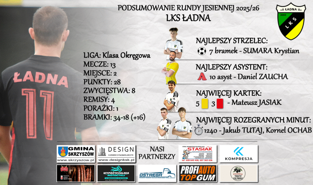 Piłkarze LKS-u Ładna mogą pochwalić się naprawdę znakomitą i bardzo udaną rundą jesienną w sezonie 2025/26. Pod czujnym okiem trenera Grzegorza Jasiaka drużyna zakończyła jesień na wysokim, drugim miejscu w tabeli, zdobywając łącznie aż 28 punktów. Bilans tego osiągnięcia to aż 8 zwycięstw, 4 remisy oraz zaledwie jedna porażka, co świadczy o dużej sile i stabilności zespołu…