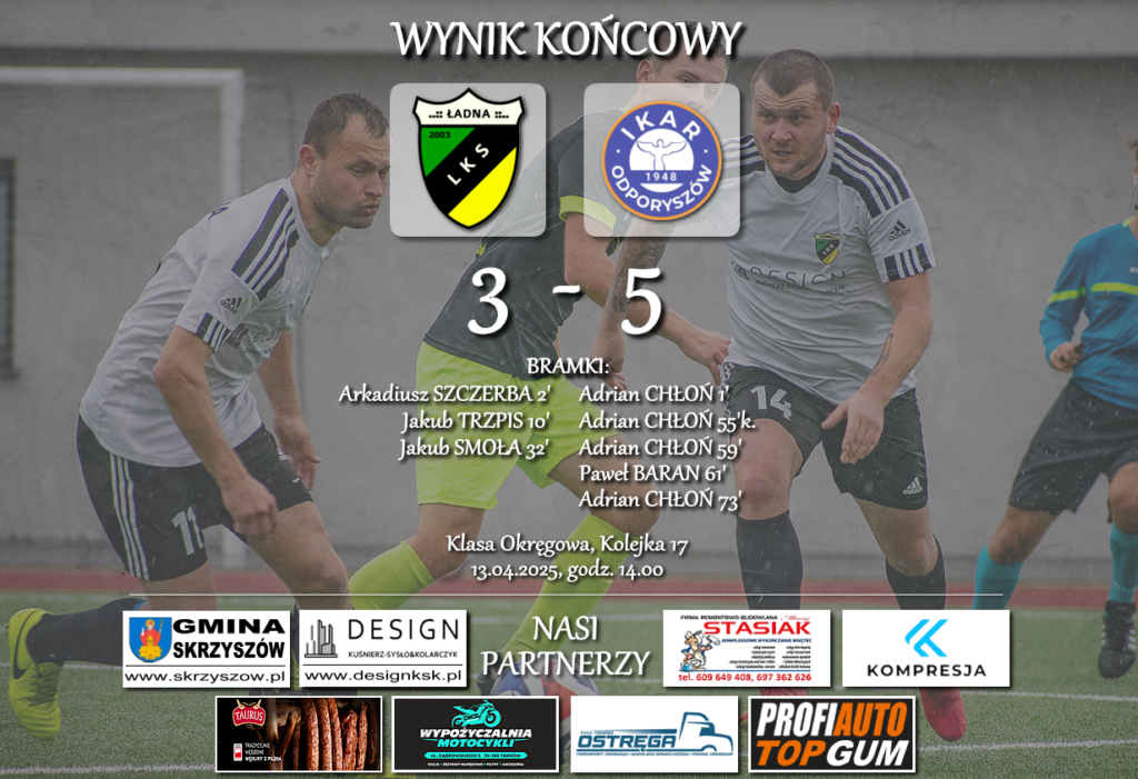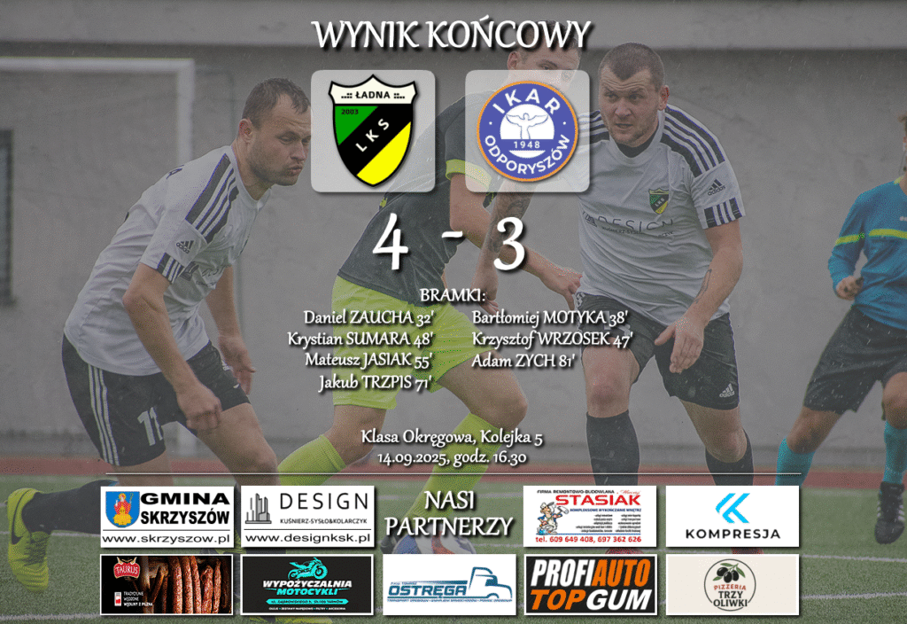Za naszymi zawodnikami kolejny emocjonujący mecz ligowy, który dostarczył kibicom wielu niezapomnianych emocji, choć ostatecznie zakończył się porażką. Na własnym stadionie LKS Ładna musiał uznać wyższość drużyny Ikara Odporyszów, przegrywając 3:5…