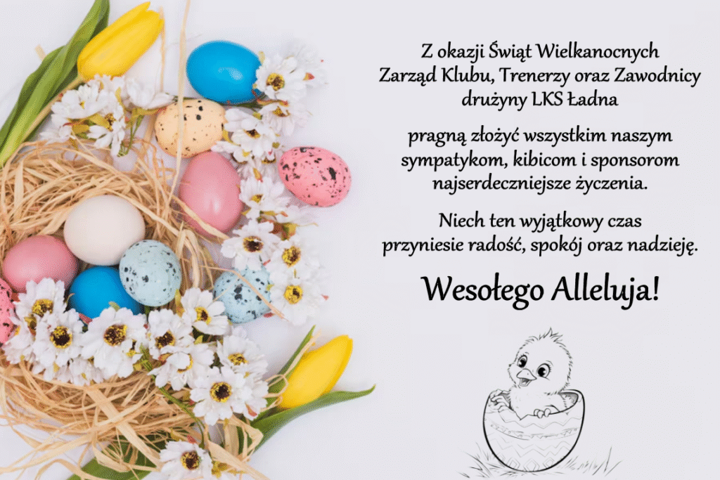 Z okazji Świąt Wielkanocnych Zarząd Klubu, Trenerzy oraz Zawodnicy drużyny LKS Ładna pragną złożyć wszystkim naszym sympatykom, kibicom i sponsorom najserdeczniejsze życzenia. Niech ten wyjątkowy czas przyniesie radość, spokój oraz nadzieję.