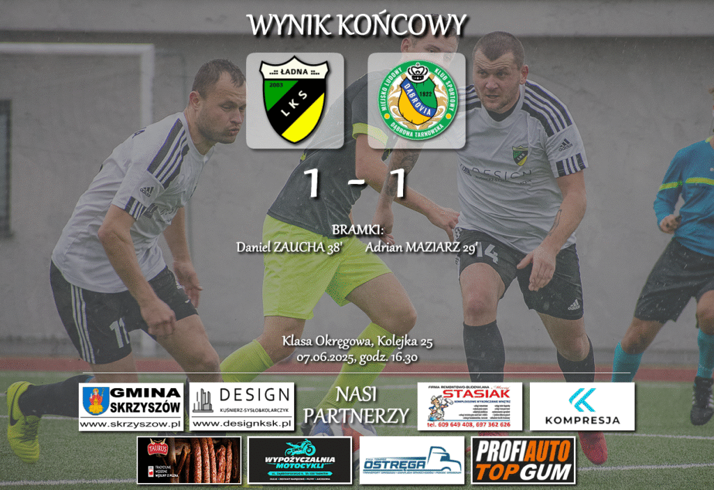 Mecz na szczycie tarnowskiej Okręgówki pomiędzy LKS Ładna a Dąbrovią Dąbrowa Tarnowska w pełni zasłużył na miano hitu kolejki i dostarczył ogromnych emocji wszystkim zgromadzonym kibicom. Mimo że wynik końcowy to zaledwie jeden gol, spotkanie trzymało w napięciu do ostatnich sekund i nie zawiodło licznie przybyłych fanów piłki nożnej. Obie drużyny zaprezentowały wyrównany, bardzo wysoki poziom gry, pokazując solidność w obronie….